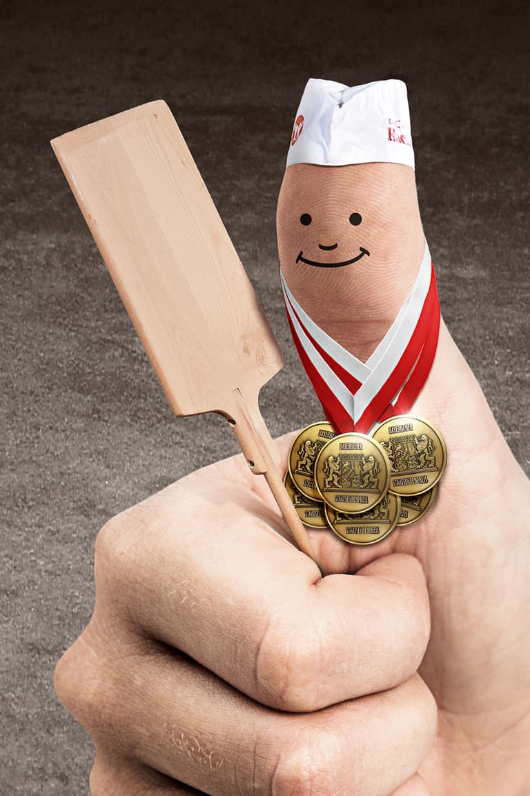 Medaillen und Hand, die Mehl stäubt